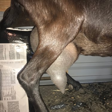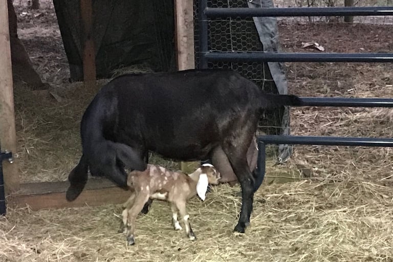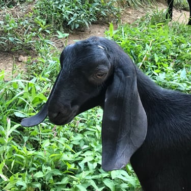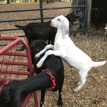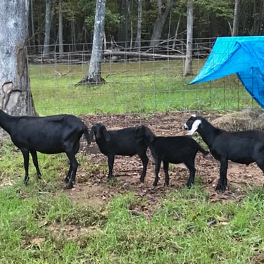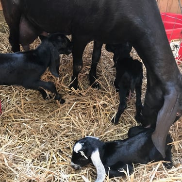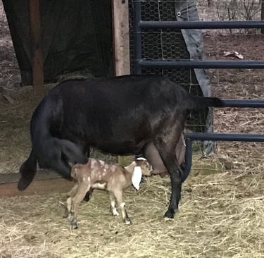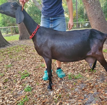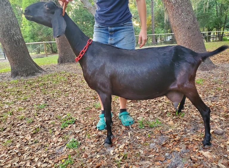 Raven is the foundation doe of our herd. She was given to us as a gift along with her brother, Gryffin. Raven was the goat who taught me all the basics of goat ownership, and cemented within me a love for diary goats. She was an incredible producer, kidding 8 times in 8 years. She was a very business-like girl, but would always get a little silly look on her face when she was asking for an animal cracker. We are forever grateful to our amazing friend who gifted us this beautiful girl. We lost her in mid-2025, but continue to enjoy her legacy in her daughters and their kids who still reside in our herd.